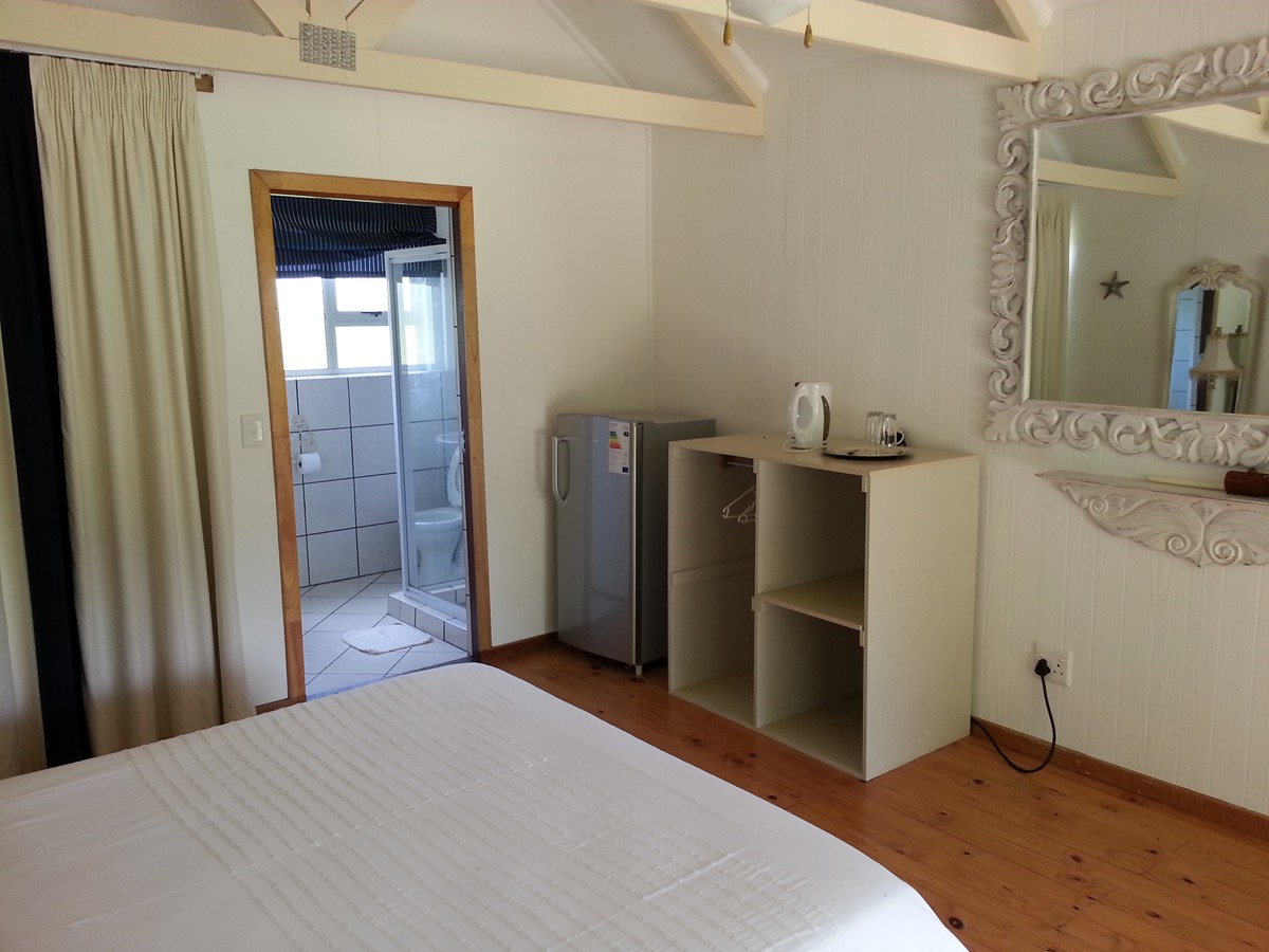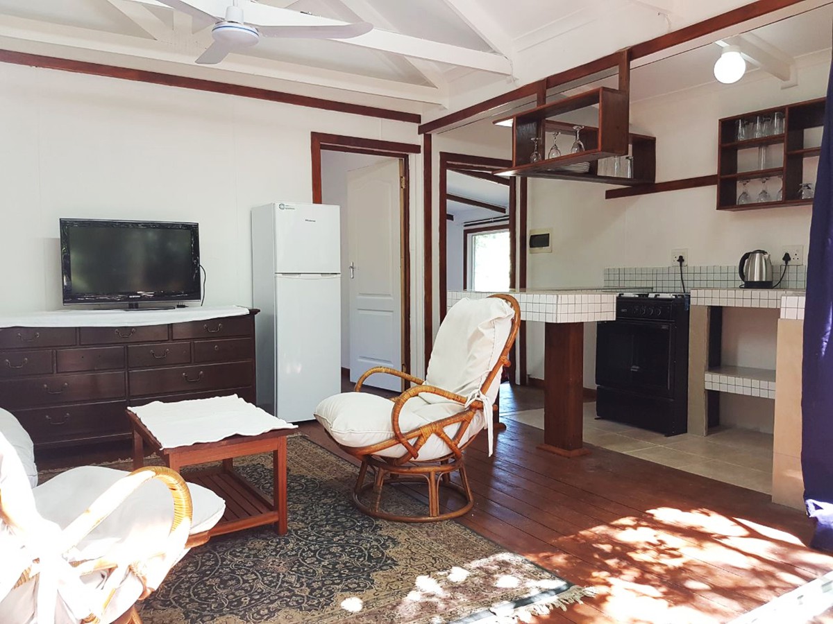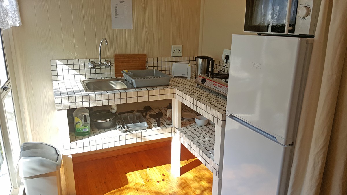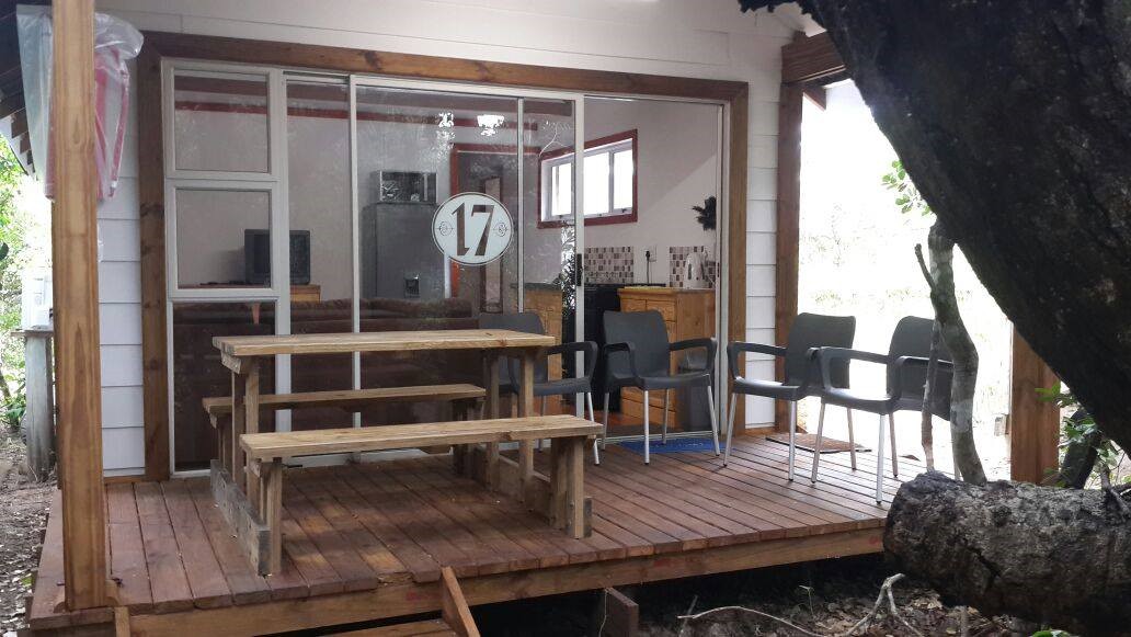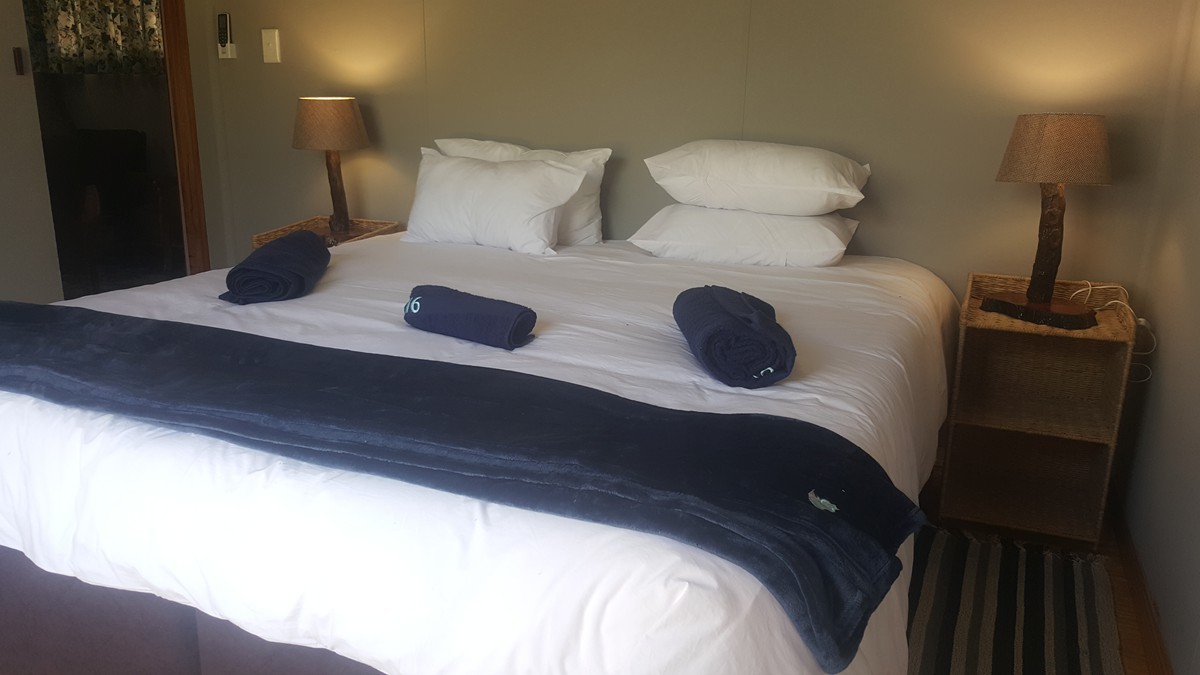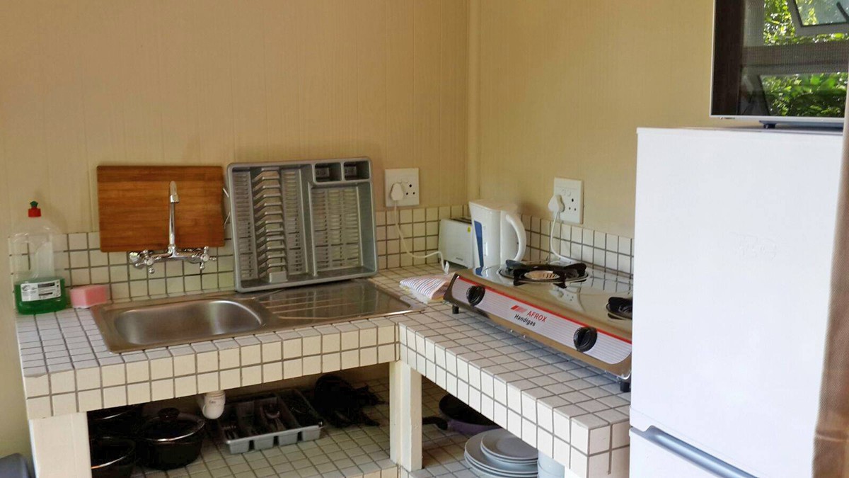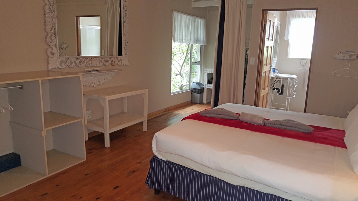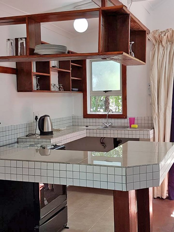 1 room en-suite with Aircon, 1 double & 2 single beds. Private kitchenette with Fridge/freezer, microwave, kettle, toaster, gas 2 plate, cutlery & crockery, pots & pan. Private braai. Covered deck with picnic table (Not suitable for 2 couples). No TV.