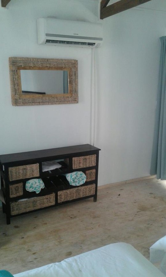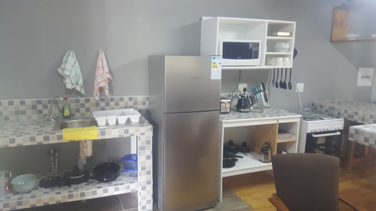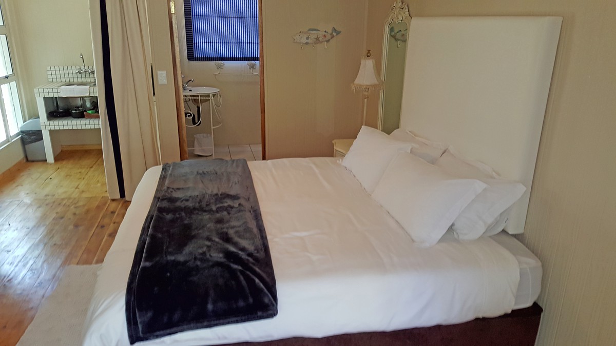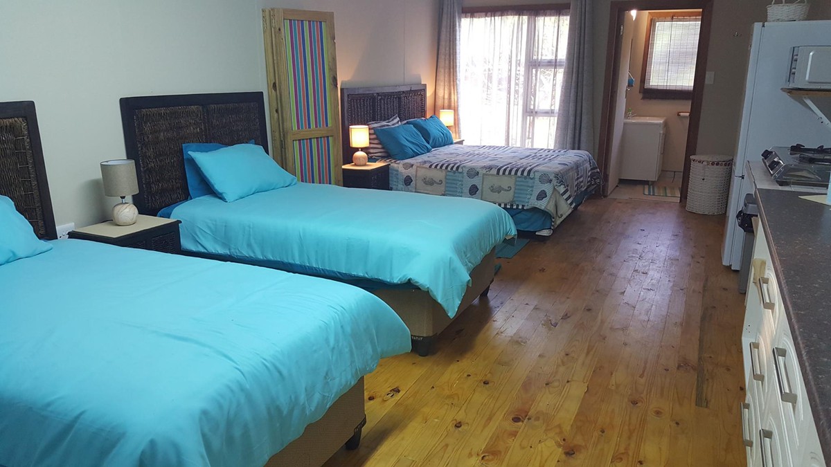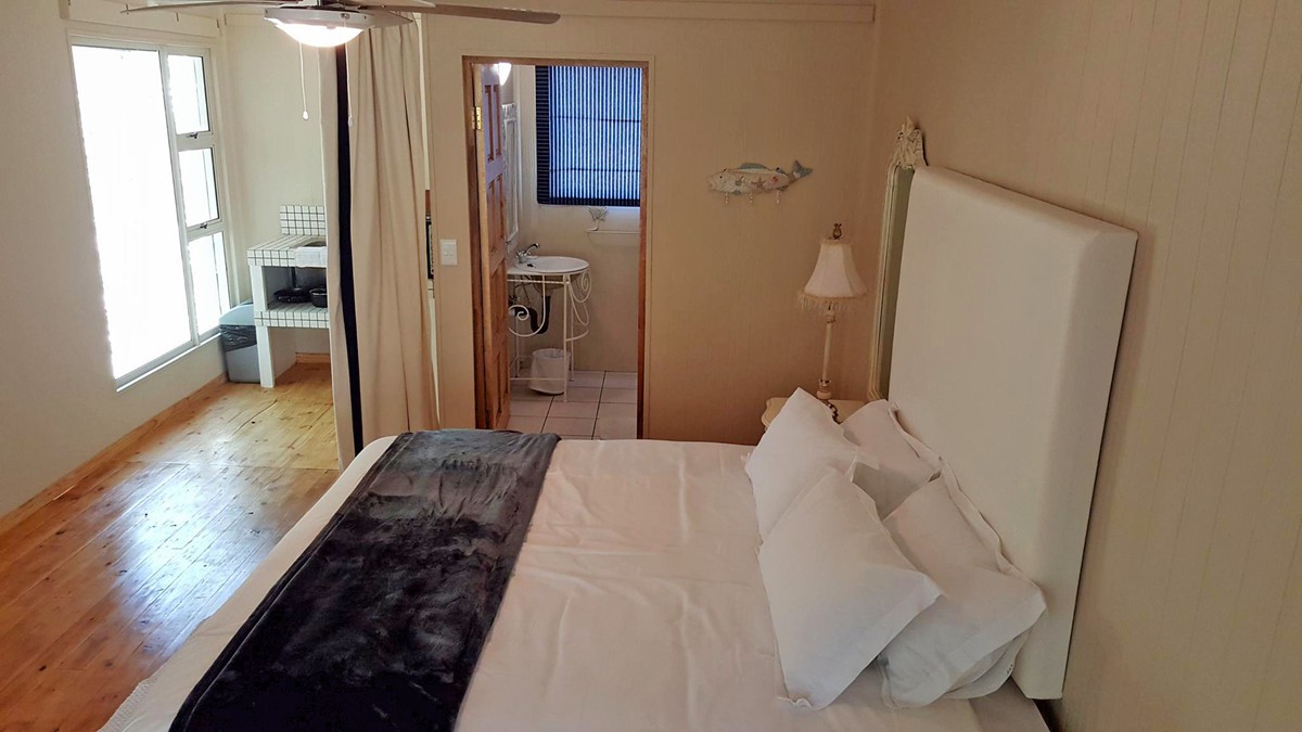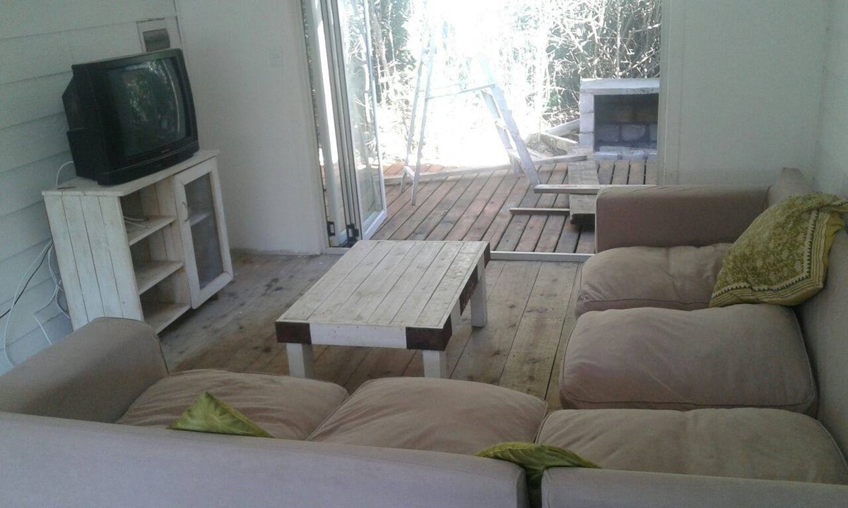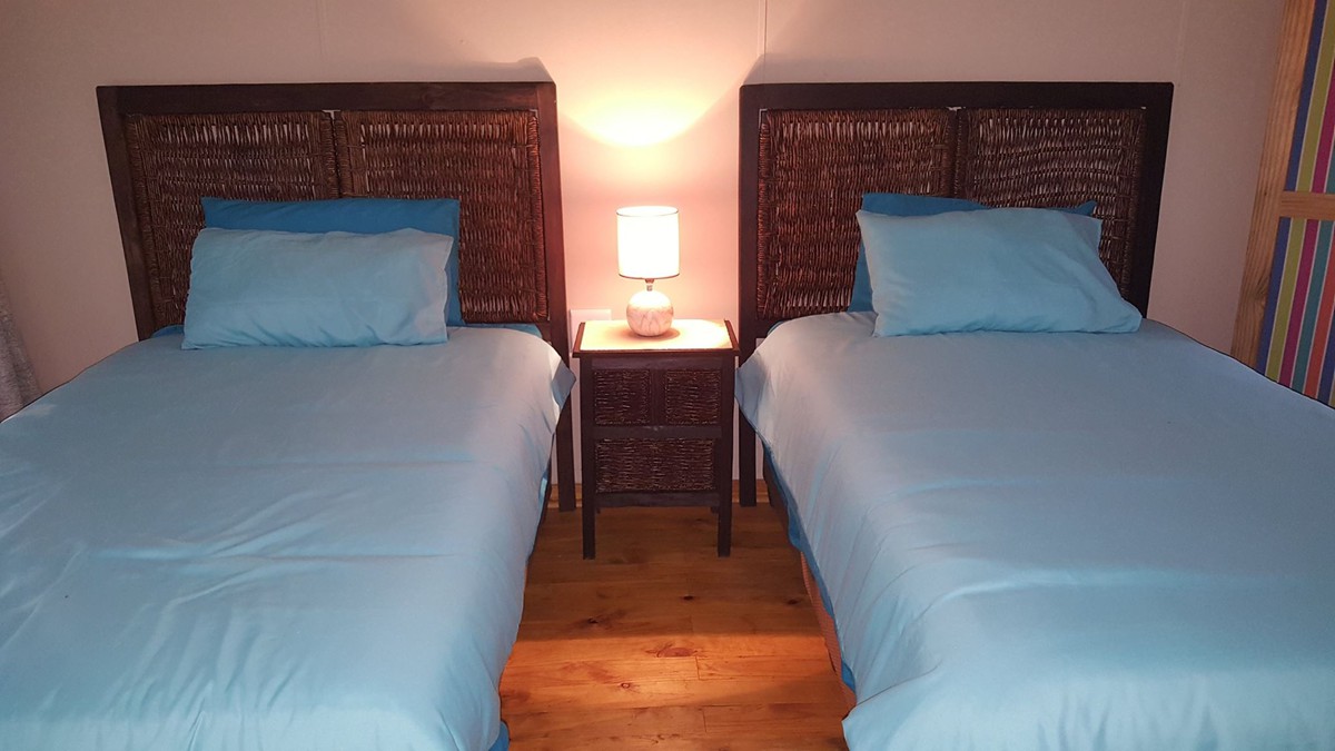 1 room en-suite with Aircon, 1 double & 2 single beds. Private kitchenette with Fridge/freezer, microwave, kettle, toaster, gas 2 plate, cutlery & crockery, pots & pan. Private braai. Covered deck with picnic table (Not suitable for 2 couples). No TV.