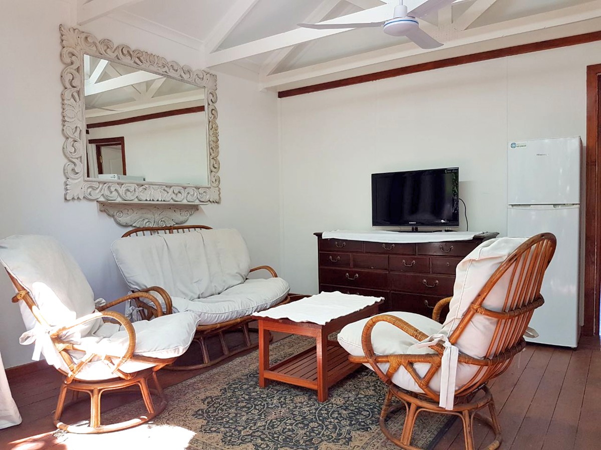 2 sleeper en-suite. Private kitchenette with fridge/freezer, microwave, kettle, toaster, gas 2 plate, cutlery & crockery, pots & pan. Ceiling fan. Covered deck with table and 2 chairs. Two single beds or king-size bed.